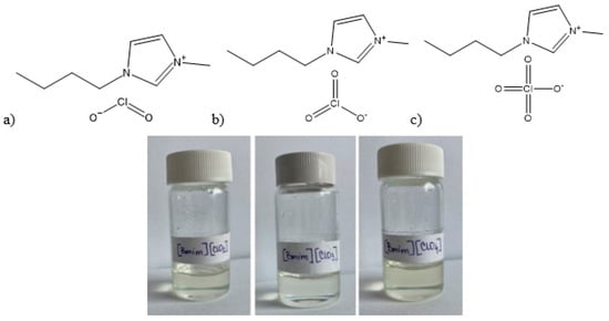The structures and the appearance of the prepared ionic liquid: (a) [Bmim][ClO2] (b) [Bmim][ClO3] and (c) [Bmim][ClO4].