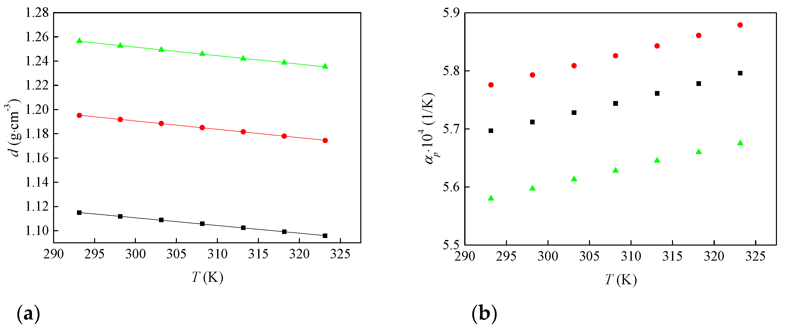 | αp∙104 (K–1) | [Bmim][ClO2] | 5.697 | 5.712 | 5.728 | 5.744 | 5.761 | 5.778 | 5.796 |