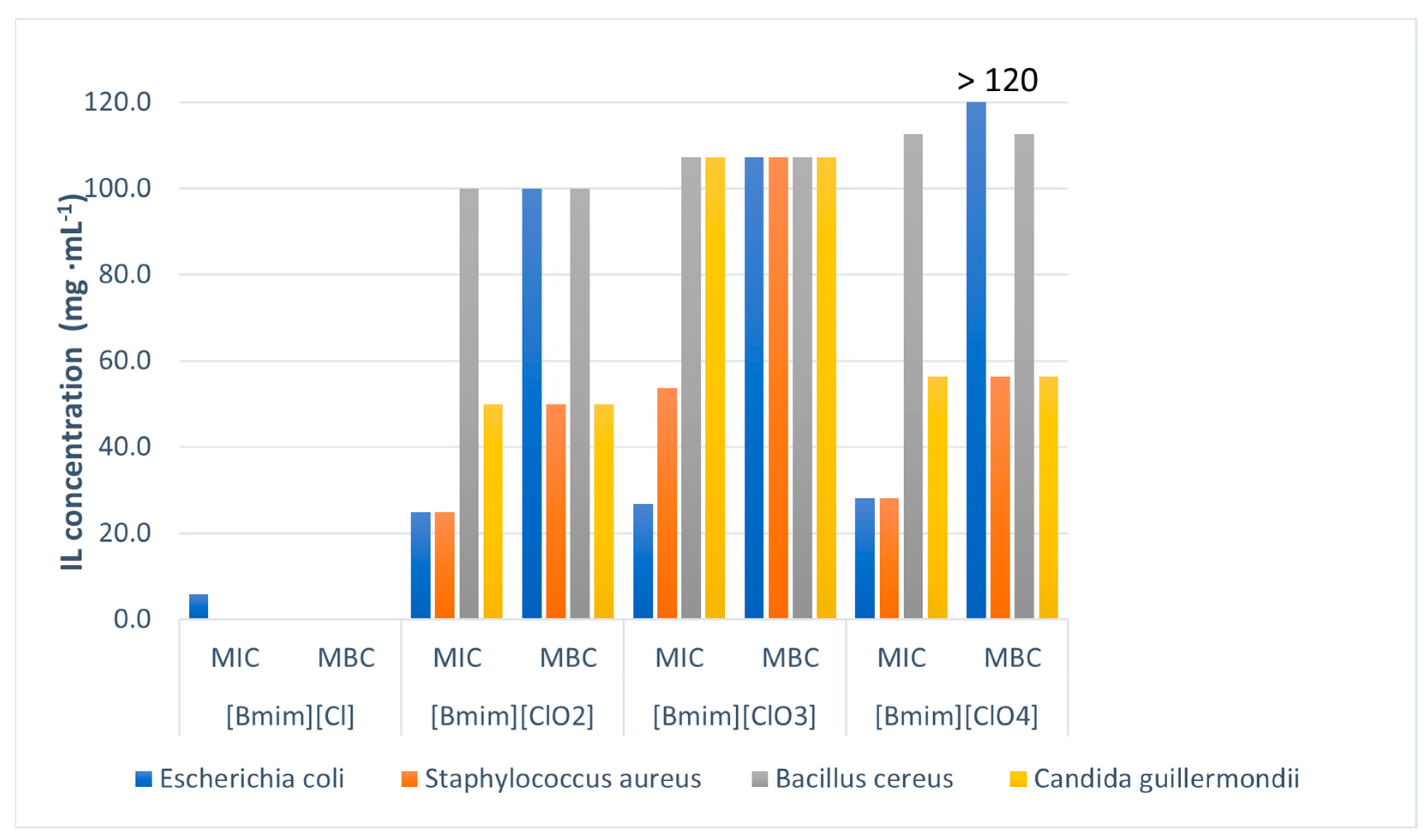 | Tested Microorganisms | [Bmim][Cl] | [Bmim][ClO2] | [Bmim][ClO3] | [Bmim][ClO4] | ||||