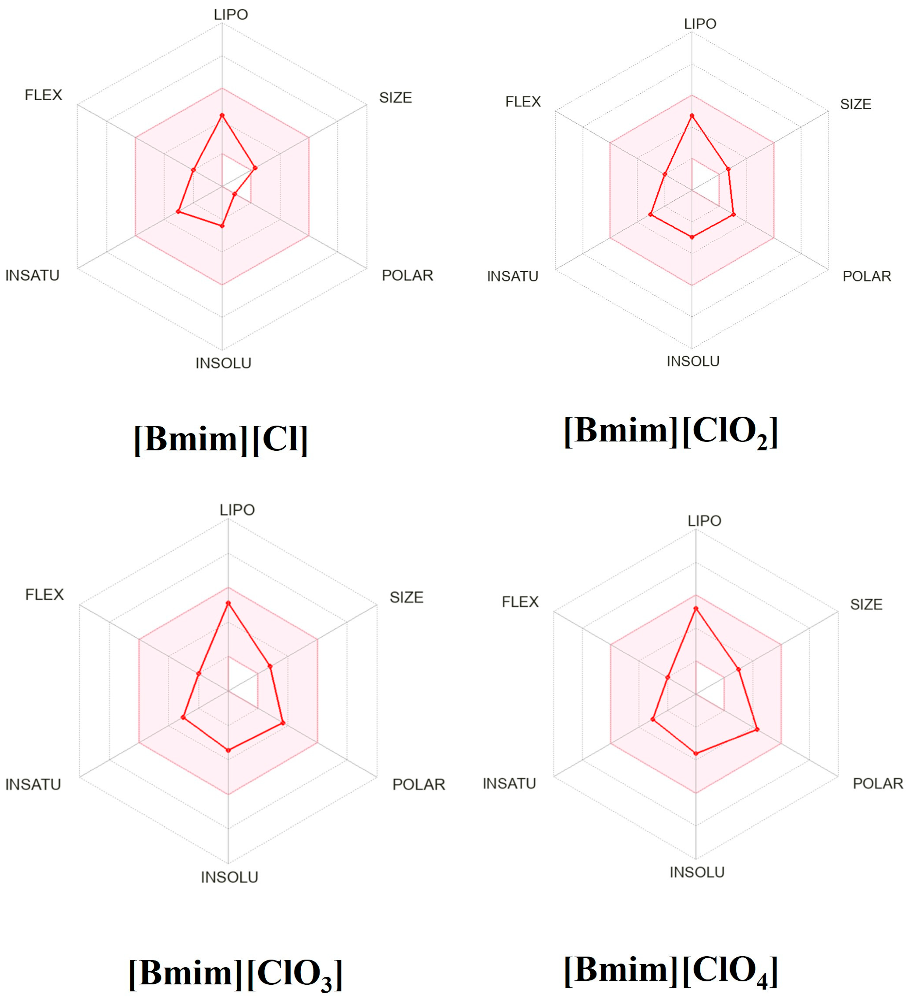 | ADMET Property | [Bmim][Cl] | [Bmim][ClO2] | [Bmim][ClO3] | [Bmim][ClO4] |