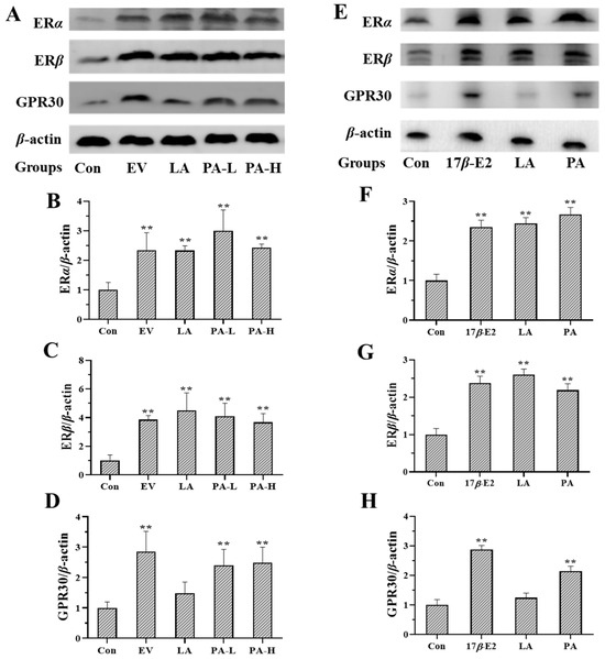 Western blot analysis of the expression of estrogen receptors in the uterus of immature female Swiss mice and MCF-7 cells (n = 3). Figure (A–D) show the expression of ERα, ERβ and GPR30 in the uterus. Figure (E–H) show the expression of ERα, ERβ and GPR30 in MCF-7 cells. ** p < 0.01 compared to controls.