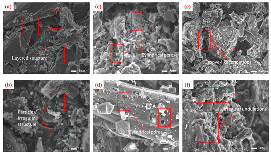 SAC presents a markedly heterogeneous surface morphology, characterized by irregular undulations and groove-like formations (Figure 1e,f). Its fragmented microstructure contains both mesoporous regions and structural collapse features, with particle dimensions spanning sub-micron to several micrometers. The surface displays numerous nanoscale fissures and defect sites, while the overall porosity appears less organized compared to CSC and CAC [14]. These morphological variations significantly influence the materials’ adsorption behaviors through differential pore accessibility.