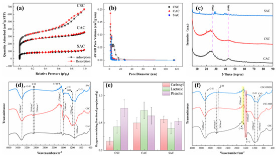 (a) Adsorption isotherm of N2. (b) Pore size distribution calculated by the NLDFT method. Square: CSC; triangle: CAC; diamond: SAC. (c) XRD of different types of AC. (d) FTIR analysis of different types of AC. (e) Boehm titration results for different types of AC. (f) Effect of single-solute adsorption experiments on functional groups on the surface of AC.