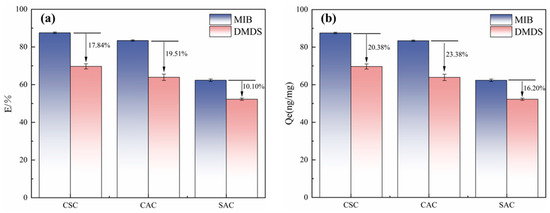 Longer contact times increase adsorption efficiency and unit adsorption capacity, as this allows more active sites on the adsorbent surface to be utilized (Figure 4b). The adsorption rate of MIB was significantly higher than that of DMDS at all adsorption times, indicating that MIB is more suitable for adsorption by ACs [5].