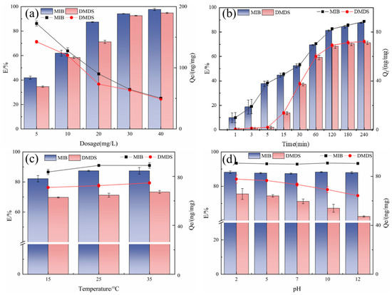 Temperature-dependent adsorption behavior was evaluated across environmentally relevant conditions (15–35 °C). As shown in Figure 4c, the adsorption efficiency increases with rising temperature: MIB removal rate increased from 82.17% (15 °C) to 87.39% (35 °C), while DMDS removal rate rose from 69.71% to 73.35% over the same range. This indicates that AC is heat-absorbing during the adsorption of MIB/DMDS, and the adsorption capacity increases with increasing temperature [29]. Despite this thermal enhancement, there is a limited magnitude of efficiency gains (≤8% total variation across the 20 °C range) [30]. This result was supported by Yuan et al. [31] and Wu et al. [32]. Based on these findings, subsequent experiments standardized conditions at 25 °C, a representative median temperature balancing adsorption efficiency with operational feasibility.
