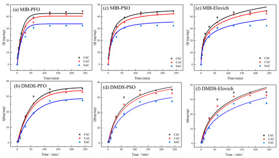 The PFO model, PSO model, and Elovich model were used to fit the experimental results, respectively, and the fitting curves are shown in Figure 5, and the corresponding data are shown in Table 2. The PFO model is an empirical model that simulates the ideal fast physical adsorption process for a monolayer [36]. Notably, the PFO model demonstrated strong correlations, with R2 values exceeding 0.94 for MIB and 0.99 for DMDS.