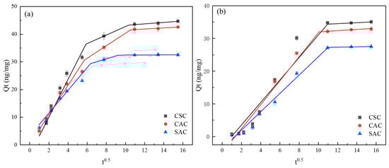 Weber–Morris model: (a) MIB; (b) DMDS.