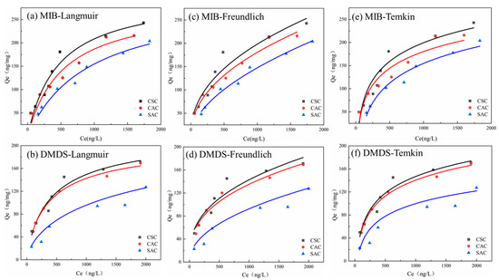 For the adsorption isotherm experiments, CSC, CAC, and SAC were evaluated in 1 L dissolved oxygen bottles. The PAC dosage varied from 0 to 40 mg/L while the initial MIB/DMDS concentration was maintained at 2000 ng/L. After an adsorption period of 240 min, which was determined from the kinetics study to be sufficient for reaching equilibrium, all samples were processed. Each experimental condition was conducted in triplicate to ensure data reliability. The samples were filtered through 0.45 μm membranes, and the concentrations of MIB and DMDS in the filtrate were quantified following the analytical procedure detailed in Section 3.3.1. Definitions and formula explanations for all models can be found in the Supplementary Materials.