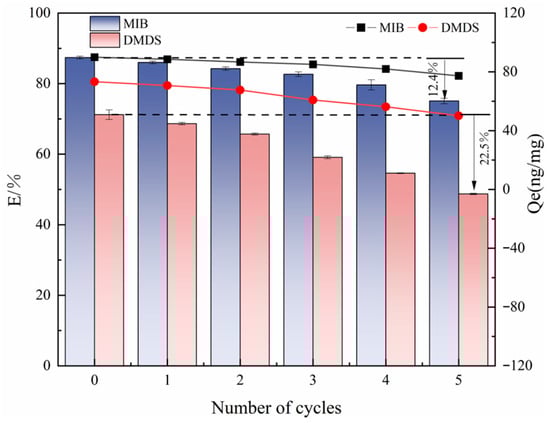 The reusability evaluation in this study was focused on the best-performing adsorbent (CSC). To this end, its cyclic regeneration performance was evaluated by a five-cycle adsorption–desorption experimental system. The quantitative analysis results showed (as shown in Figure 9) that the Qe of CSC on MIB only decreased by 5.4% after three cycles. A more pronounced decreasing trend was observed after the fourth cycle, while the adsorption of DMDS by CSC could only be maintained at a high level in the first two cycles. After five cycles, the adsorption capacity retention of CSC for MIB remained at the level of >75% after the complete cycle test, which was only decreased by 12.4% compared with the initial value. Qe decreased by 12.69 ng/mg, demonstrating good cyclic stability. However, the adsorption efficiency for DMDS showed a significant decay trend from the initial 71.20% to 48.74%. Qe decreased by 23.13 ng/mg. This differential cycling performance may be related to the limited solubility of DMDS in methanol solvent—its lower solubility characteristics led to restricted desorption kinetics, resulting in incomplete regeneration of the active site. Future work should include a comparative analysis of the regeneration potential of different activated carbons to comprehensively evaluate their economic and practical feasibility.