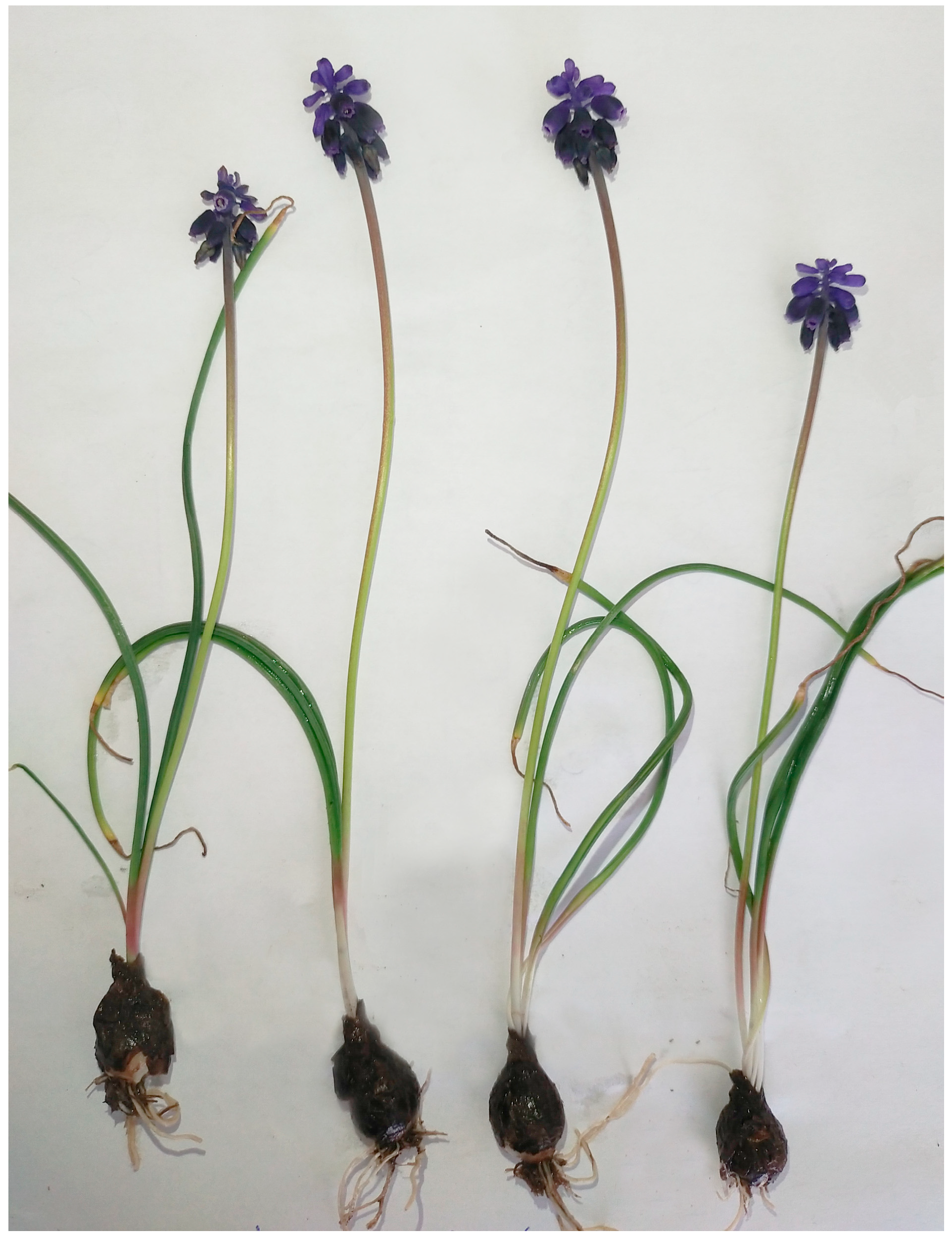 - Bokov, D.O. Muscari armeniacum Leichtlin (grape hyacinth): Phytochemistry and biological activities review. Asian J. Pharm. Clin. Res. 2019, 12, 68–72. [Google Scholar] [CrossRef]