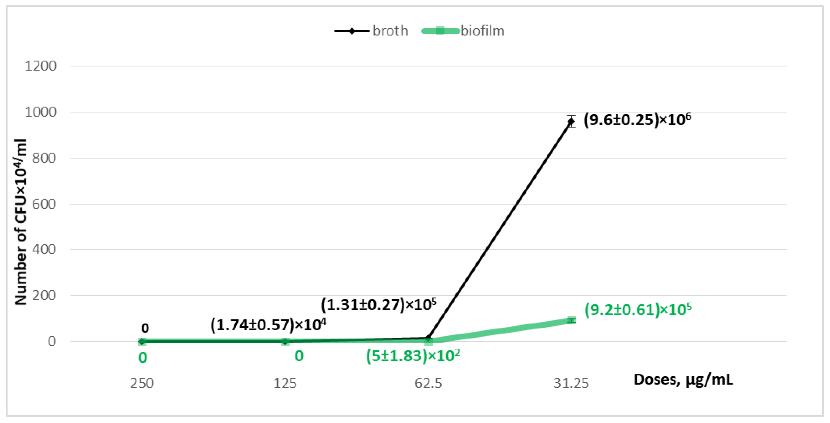 | Doses (M ± m), µg/mL | 250 | 125 | 62.5 | 31.25 | Culture Control |