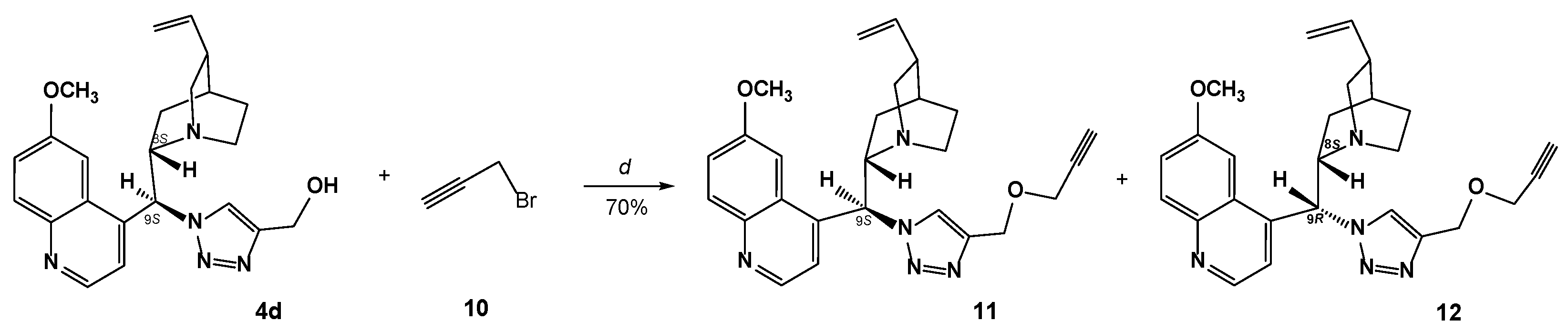 - Kacprzak, K.; Migas, M.; Plutecka, A.; Rychlewska, U.; Gawroński, J. The library of Cinchona alkaloids—1,2,3-triazole derivatives: Structure and facile access by “Click Chemistry”. Heterocycles 2005, 65, 1931–1938. [Google Scholar] [CrossRef]