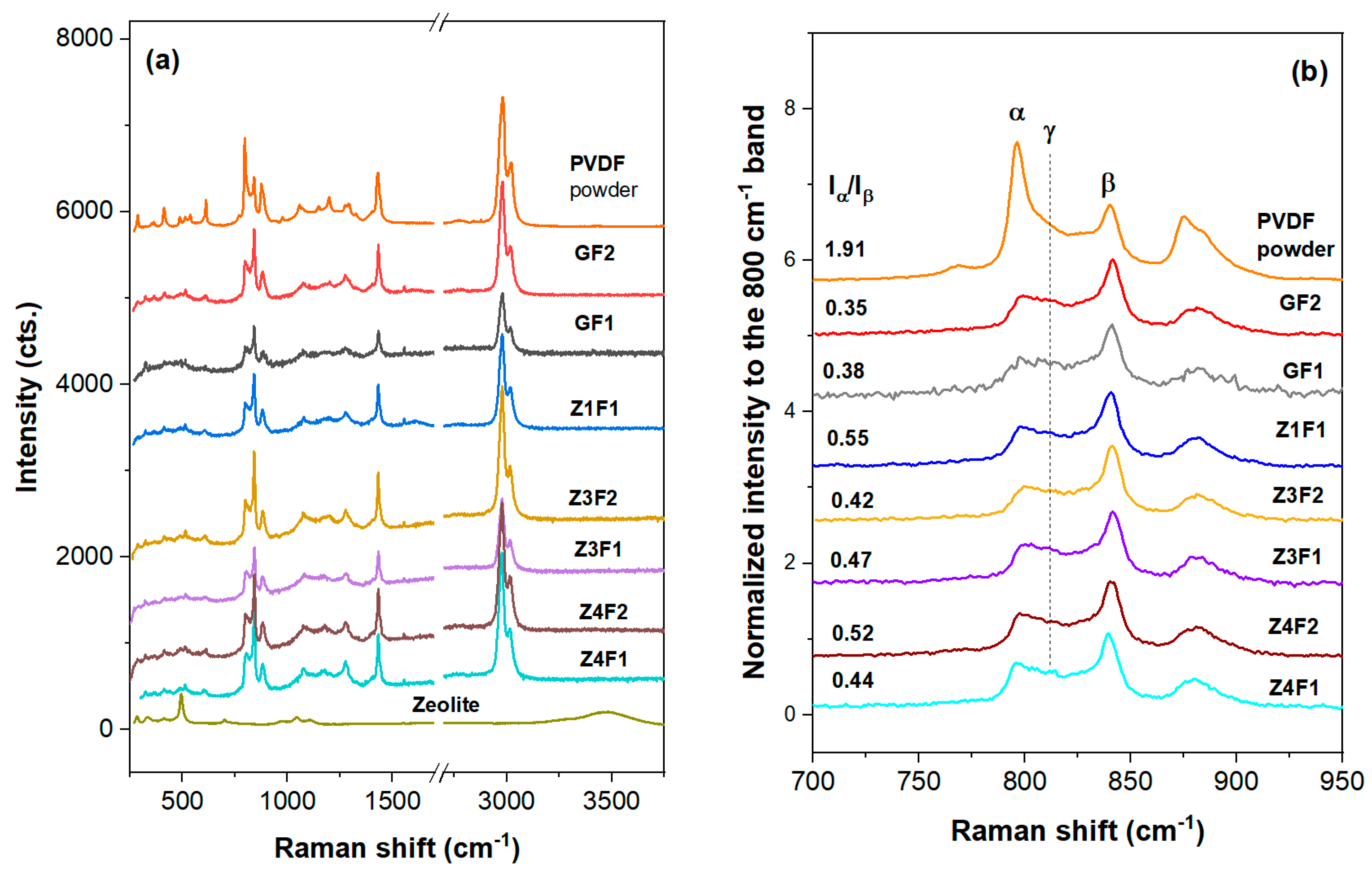 - Chapron, D.; Rault, F.; Lemort, G.; Cochrane, C.; Devaux, E.; Campagne, C. In-situ Raman monitoring of the poly(vinylidene fluoride) crystalline structure during a melt-spinning process. J. Raman Spectrosc. 2021, 52, 1073–1079. [Google Scholar] [CrossRef]