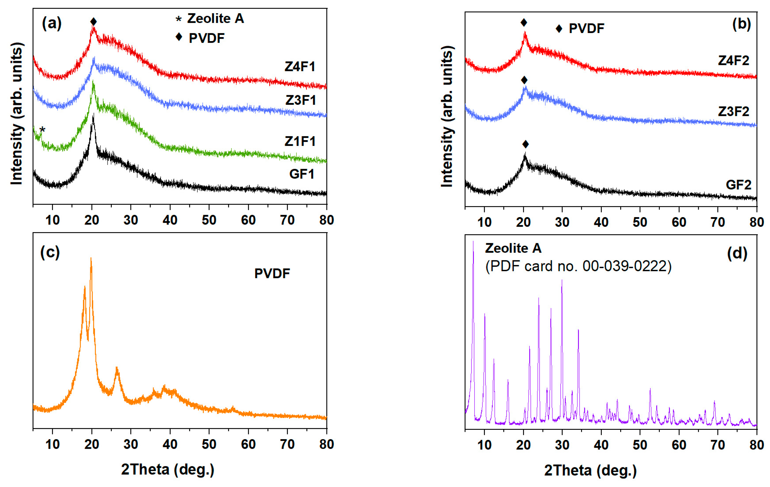 - Lopes, A.C.; Ribeiro, C.; Sencadas, V.; Botelho, G.; Lanceros-Méndez, S. Effect of filler content on morphology and physical–chemical characteristics of poly(vinylidene fluoride)/NaY zeolite-filled membranes. J. Mater. Sci. 2014, 49, 3361–3370. [Google Scholar] [CrossRef]