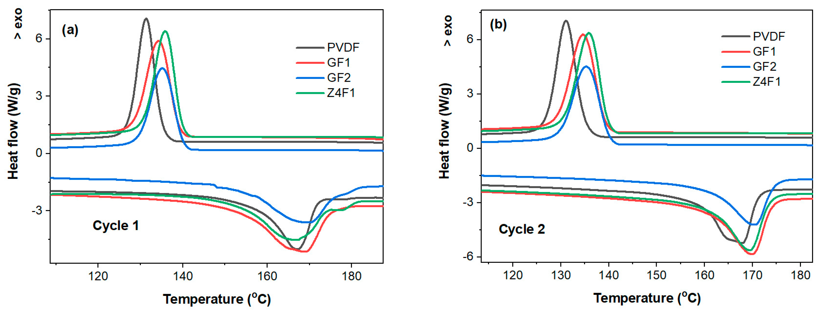 - Purushothaman, S.M.; Tronco, M.F.; Poncot, M.; Chitralekha, C.S.; Guigo, N.; Malfois, M.; Kalarikkal, N.; Thomas, S.; Royaud, I.; Rouxel, D. Quantifying the Crystalline Polymorphism in PVDF: Comparative Criteria Using DSC, WAXS, FT-IR, and Raman Spectroscopy. ACS Appl. Polym. Mater. 2024, 6, 8291–8305. [Google Scholar] [CrossRef]