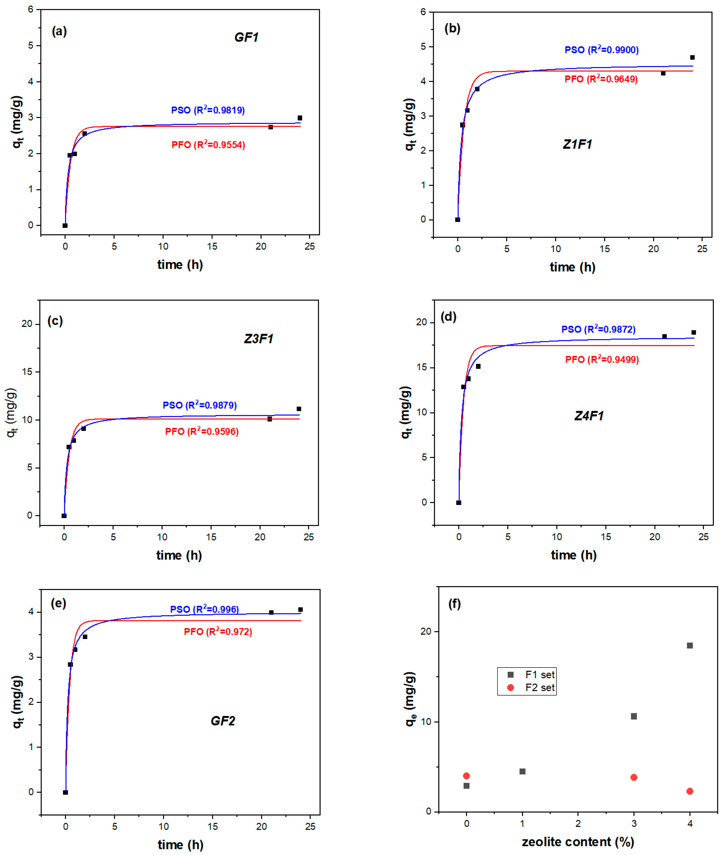 | PFO | qe (mg/g) | 2.75373 ± 0.1560 | 4.2968 ± 0.2213 | 10.1003 ± 0.5387 | 18.4422 ± 1.0284 | 3.8112 ± 0.1642 |