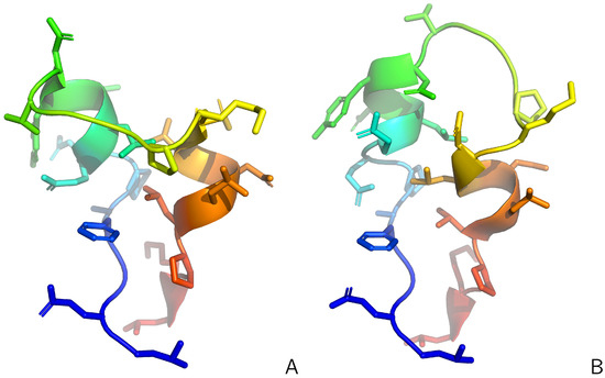Structures #1 (A) and #6 (B) of the 2KW5 (L129–L153) used to generate synthetic interproton-distance restraints. The backbones are shown in the cartoon representation and the side chains are shown as sticks, respectively. The chains are colored from blue to red from the N- to the C-terminus. Adapted from Ref. [47]. under the Creative Commons (CC-BY-4.0) license. The pictures were made with PyMOL Version 3.1.6.1 [65].