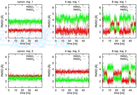 In Figure 3, the variation of RMSD from structures #1 () and #6 () that were used to derive the average proton-proton distance restraints is shown for 2 representative trajectories of plain canonical simulations (no replica averaging), 2 trajectories taken from a replica-averaged simulation with 4 replicas, and 2 trajectories taken from a simulation with 8 replicas, respectively. As can be seen from Figure 3, one of the two canonical (with no replica averaging) trajectories shown stays around structure #1 and the other one around structure #6, respectively. Thus, running multiple canonical MD trajectories restrained by averaged interproton-distance restraints without any restraint averaging can retrieve both conformations from which the restraints were derived. However, even for this simple system a trajectory is stuck in the initially encountered extended energy basin. This observation was made by earlier researchers who considered model double-well energy functions [53,55,67]. With averaging over 4 replicas, the behavior is qualitatively similar; however, and vary significantly more and lower values of these quantities are attained. With 8 replicas, quite frequent transitions are observed between structures #1 and #6, which is manifested as reciprocating jumps from low to higher values of and . Such jumps between the two energy basins were also observed in earlier studies in which model double-well potentials were considered [53,55,67].