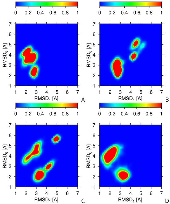 Heat maps maps the -RMSD distributions from structure #1 () and #6 () of 2KW5 (129–153). (A) 8 independent canonical trajectories (no replica averaging). (B) Another batch of 8 independent canonical trajectories. (C) 4 replica-averaged runs, each with 2 replicas. (D) 2 replica-averaged runs, each with 4 replicas. The statistics was collected over the second half [5,000,000 time steps of which every 10,000th point (500 snapshots) were collected] of each trajectory. The color scale is above each panel. The plots were made with gri [68].