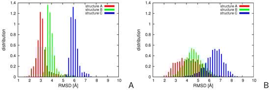 We started from the simulations with replica-averaged distance and angular restraints in the temperature replica-exchange mode for the putatively three-state 2LWA small protein [69]. The settings of these calculations are described in Section 3.6. The distributions of the RMSD of the structures of the conformational ensemble at K from mean structures (chains) A, B, and C, respectively, of the 2LWA PDB entry obtained in simulations with replica-averaged restraints are compared with those obtained with non-averaged restraints in Figure 6. As can be seen, the distributions of the RMSDs from partially-open and open structures B and C obtained with replica-averaged restraints spread to lower RMSD values compared to those obtained with non-averaged restraints. All RMSD distributions become significantly broader and shifted to higher RMSD values following the introduction of replica-averaged restraints. The right shift is strictly connected with broadening because RMSD has the meaning of distance and, consequently, increasing the spread of the distribution of conformations results in the right shift of the mean distance of a conformation from a given reference structure. The results demonstrate that the partially-open and open structures B and C become more visited when the simulations are carried out with replica-averaged restraints. On the other hand, as also found in our earlier study in which time-averaged restraints were applied [47], 2LWA should be considered as an ensemble of conformations gradually passing from the helical hairpin (structure A) to a kinked helix (structure C) rather than as a three-state system.