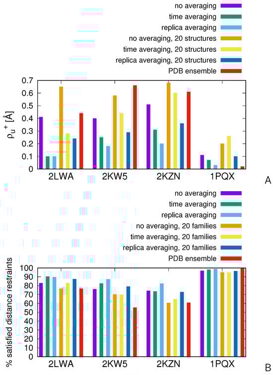 Bar plots of the measures of the compatibility of the ensemble-averaged interproton distances for 2LWA, 1PQX, 2KW5, and 2KZN calculated from the results of MREMD simulations without averaging, with replica-averaged restraints, with time-averaged restraints (the length of the memory window being ps and full-average-update frequency being steps, respectively, data from [47]), and those averaged over the structures of the ensembles from the respective PDB entries, respectively. (A) Mean-square deviations of the ensemble-averaged interproton distances from the upper boundaries of the NMR-determined distances, [Equation (17)]. (B) The percentages of satisfied restraints. The errors of and those of the percentages of satisfied distance restraints, which were estimated by splitting the set of conformations used in the analysis into two independent subsets and calculating the and the percentages of satisfied restraints for each of them, are less than 0.01 Å and less than 1 %, respectively. The plots were made with gnuplot [66].