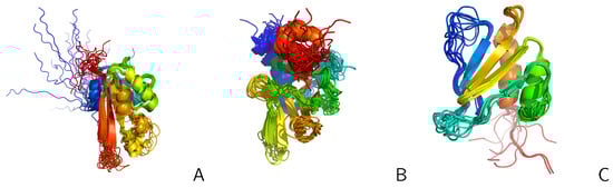 NMR ensembles of the three proteins from the Montelione/NEF Benchmark Set [83]: (A) 2KW5, (B) 2KZN, (C) 1PQX in the cartoon representation. The chains colored blue to red from N- to C-terminus. The disordered loops are exposed. The pictures were made with PyMOL [65].