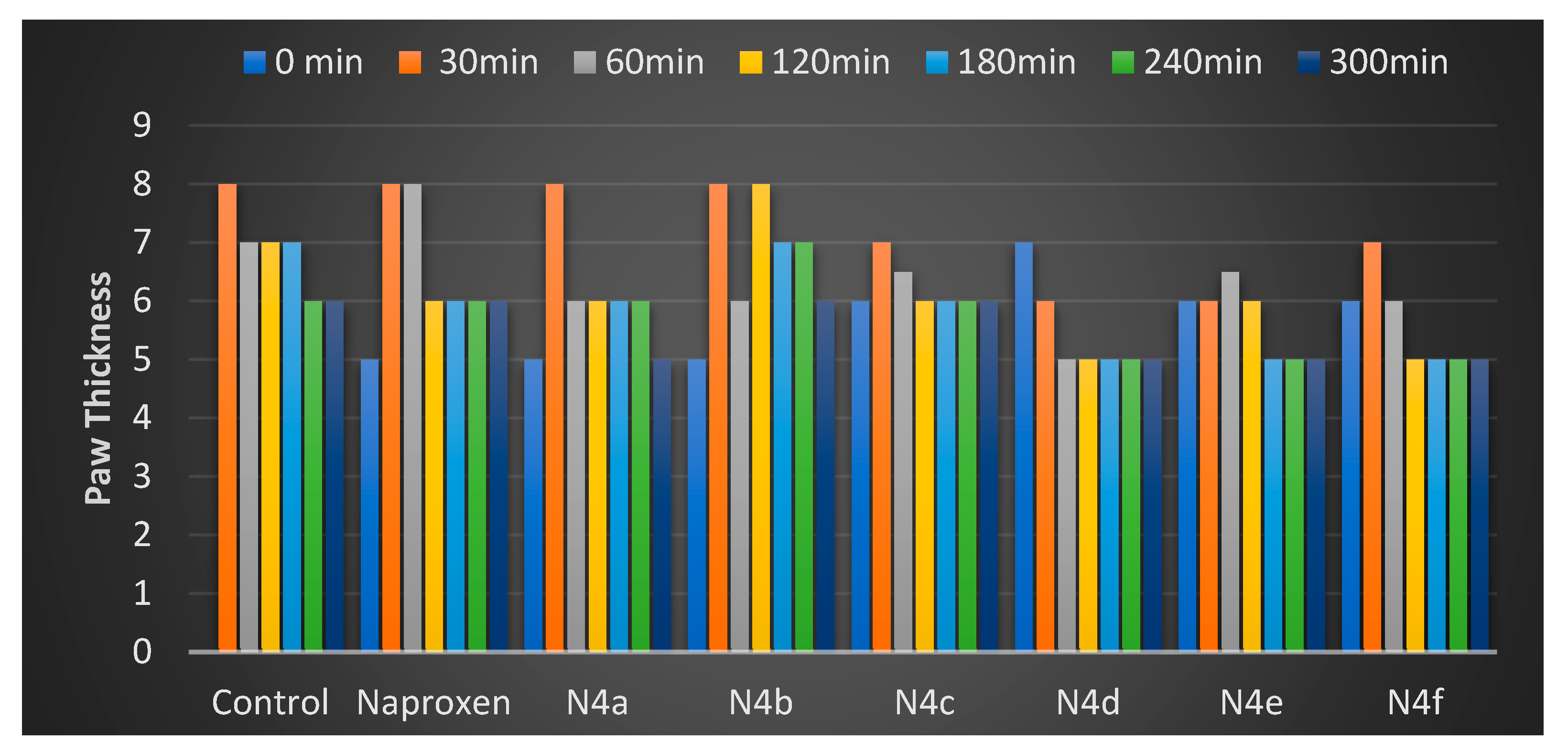 | Paw Thickness (mm)/n = 6 | Control | 6.02 ± 0.04 | 8.33 ± 0.06 | 7.54 ± 0.06 | 7.35 ± 0.07 | 7.15 ± 0.05 | 6.24 ± 0.04 | 6.20 ± 0.02 | 0 |