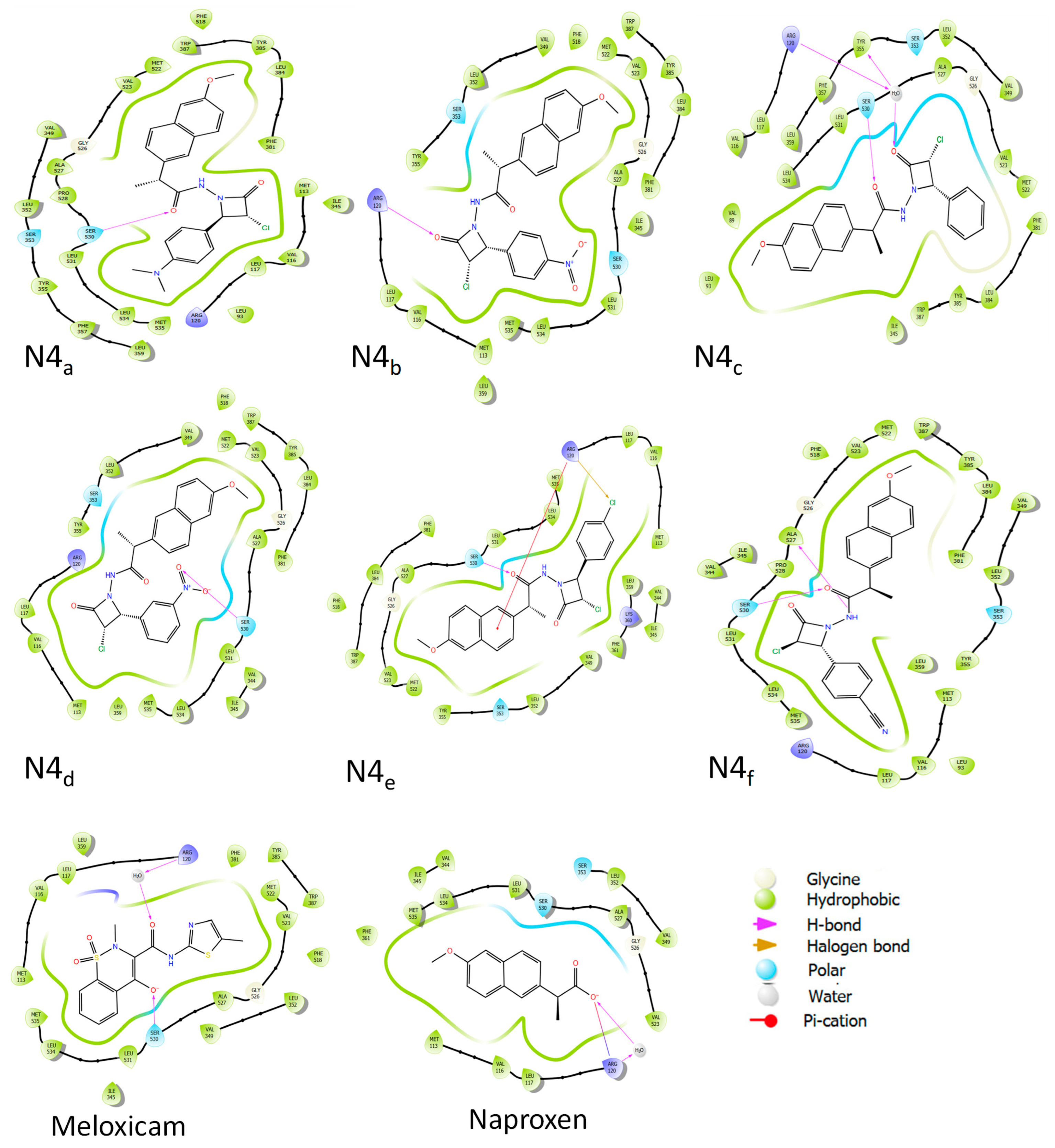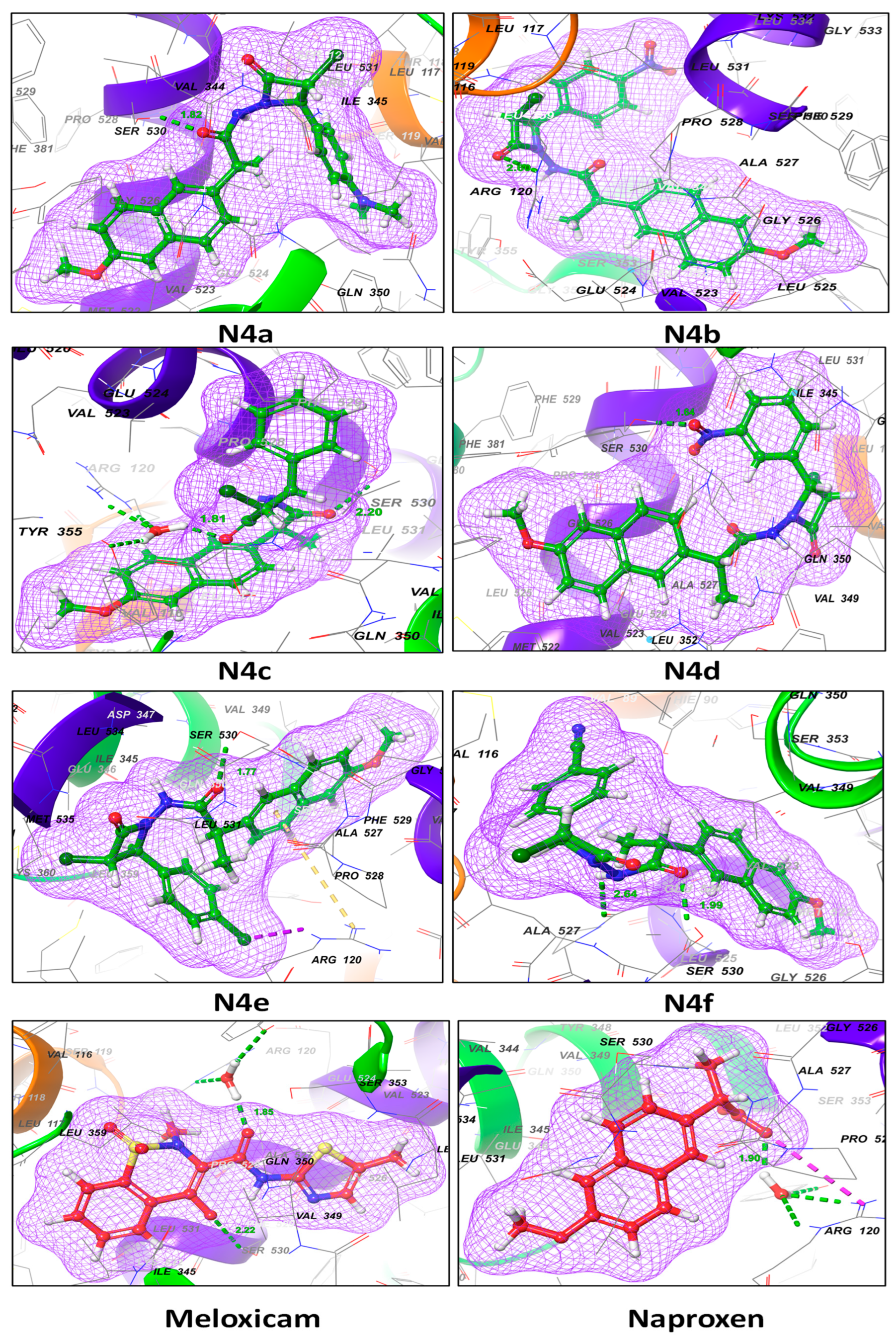 | 1 | N4a | ![]() | Murine cyclooxygenase-2 (PDB: ID: (4M11) | −11.93 | −38.2 ± 0.6 | SER530 | - | LEU531, LEU534, MET535, ARG120, LEU117, VAL116, MET113, PHE381, TYR385, TRP387, MET522, VAL523, GLY526 * |