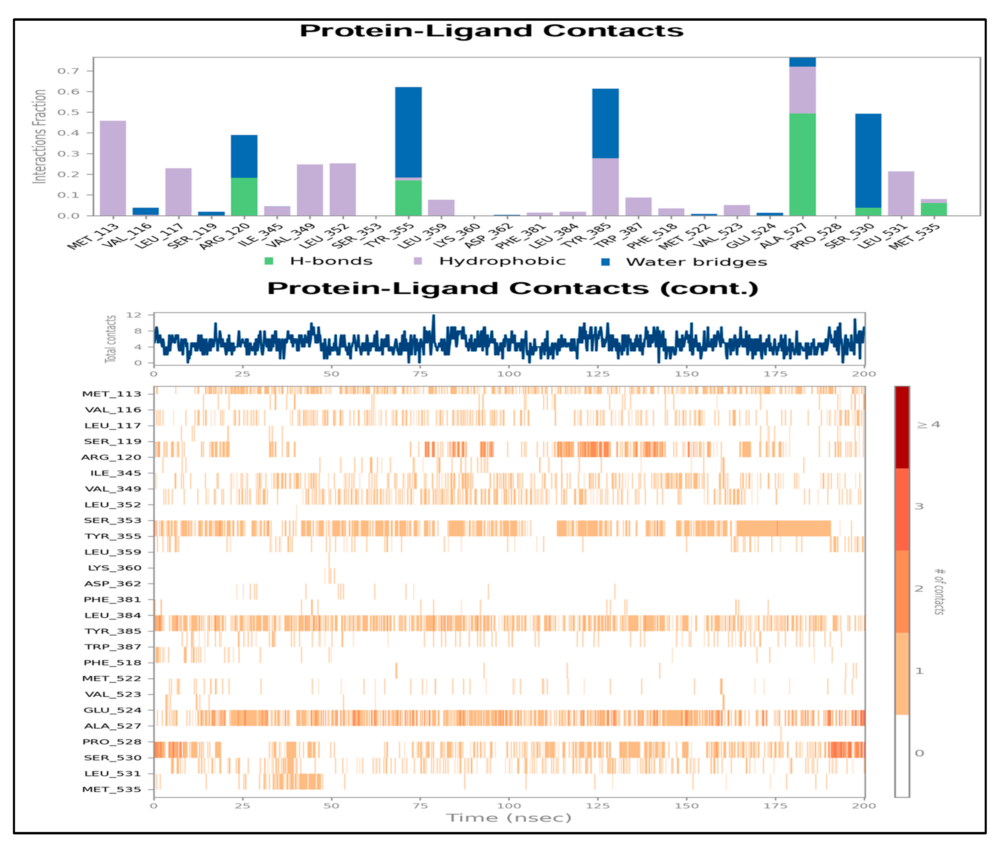 | 3 | N4c | ![]() | −10.92 | −62.2 ± 0.7 | ARG120, TYR355, SER530 | - | VAL89, LEU93, ILE345, TRP387, TYR385, PHE381, GLY326 *, SER353 * | |