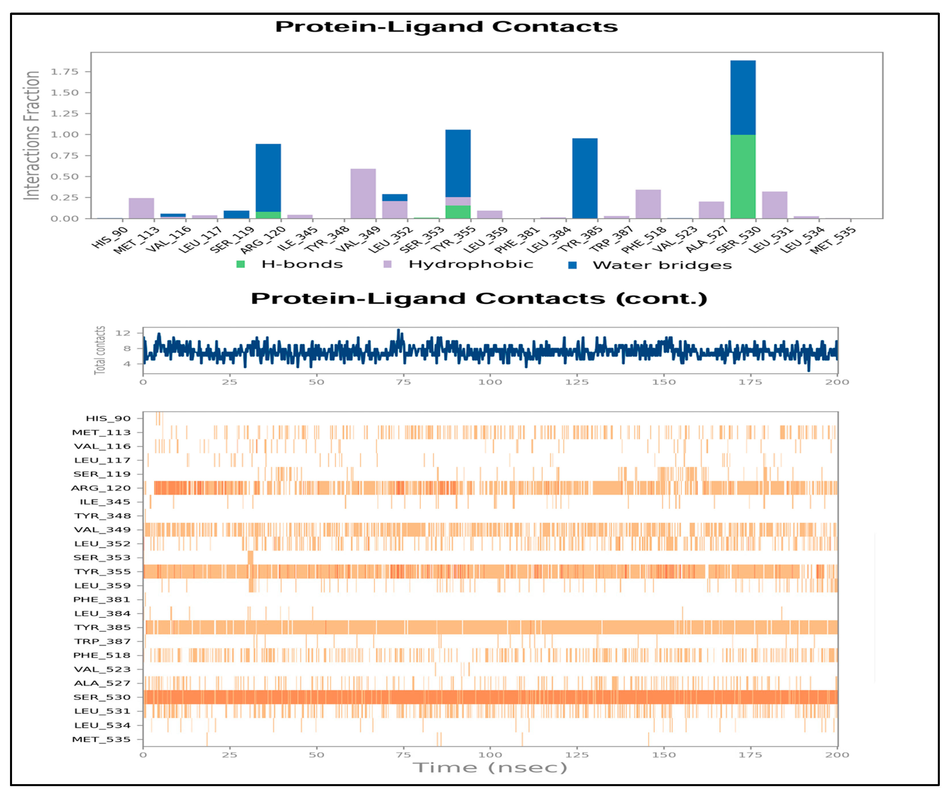 | 8 | Meloxicam | ![]() | −9.30 | −30.8 ± 0.5 | SER530, ARG120 | - | MET113, MET535, LEU534, LEU531, ALA527, GLY526 *, VAL523, MET522, ARG120 | |