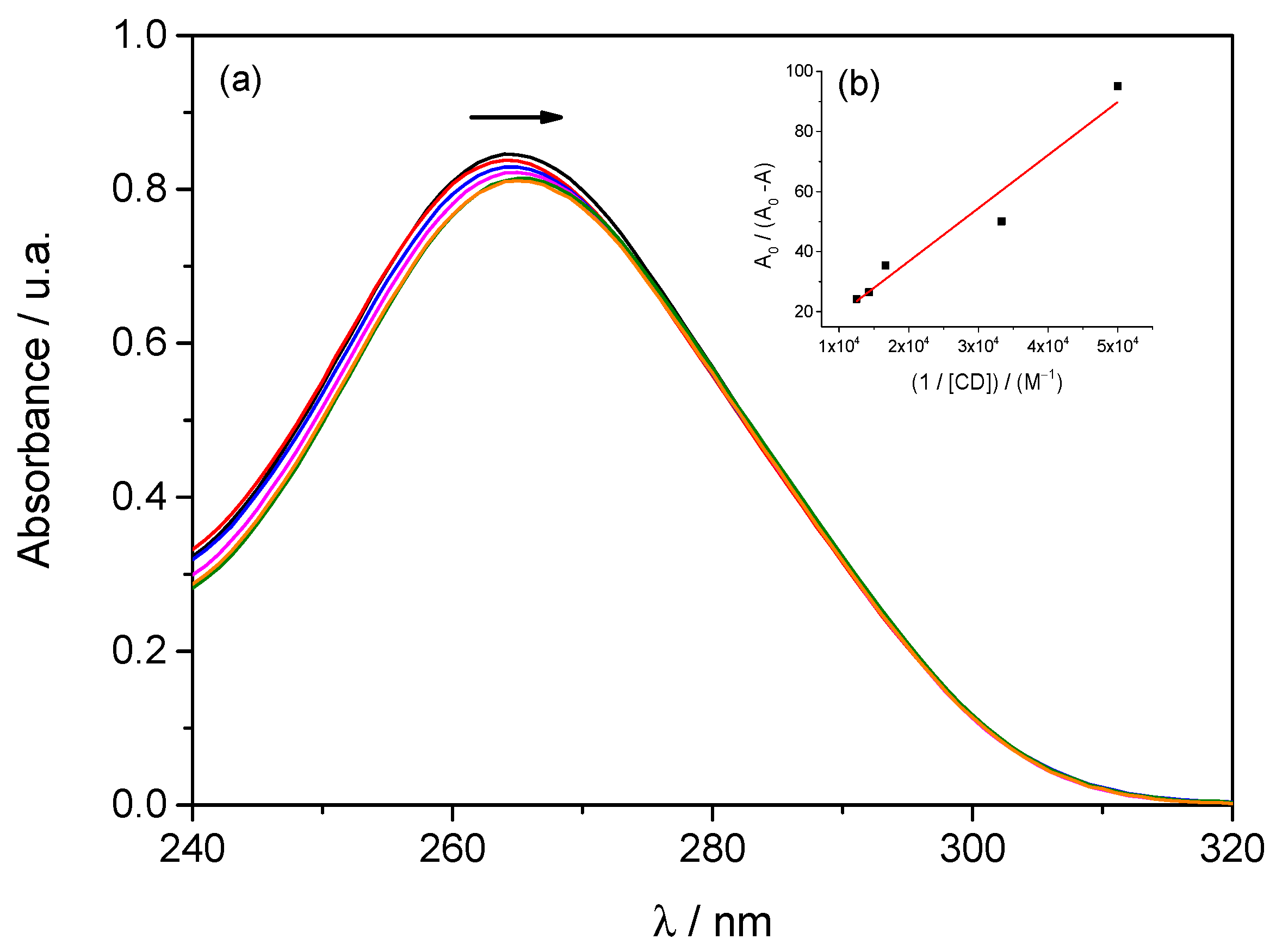 ) mmol·dm−3; (b) Variation of absorbance as a function of the inverse of CD concentration.