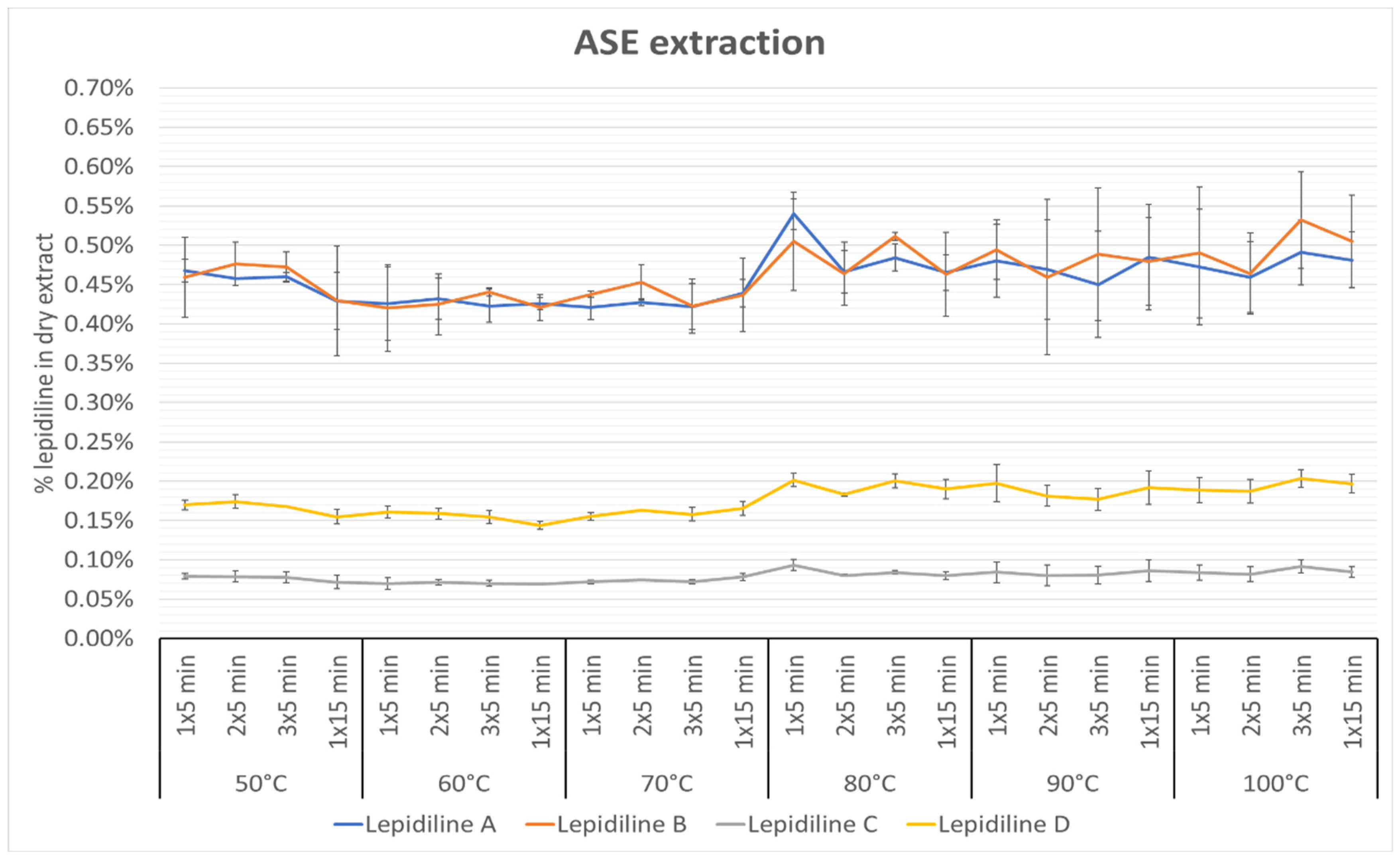 22]. In the case of ASE extraction, optimal results were achieved at temperatures between 80–100 °C, where non-thermal degradation of the alkaloids was detected. The lepidilines A and B extraction yields were consistent across all tested temperature ranges, extraction durations, and cycle numbers. At the same time, lepidiline D was observed in higher concentrations, followed by lepidiline C. The study demonstrated that the type of solvent played a pivotal role in the recovery of lepidilines from the plant matrix. The solubility, dissolution, and mass transfer of these components were contingent upon the polarity and nature of the solvent, as previously established in the scientific literature [