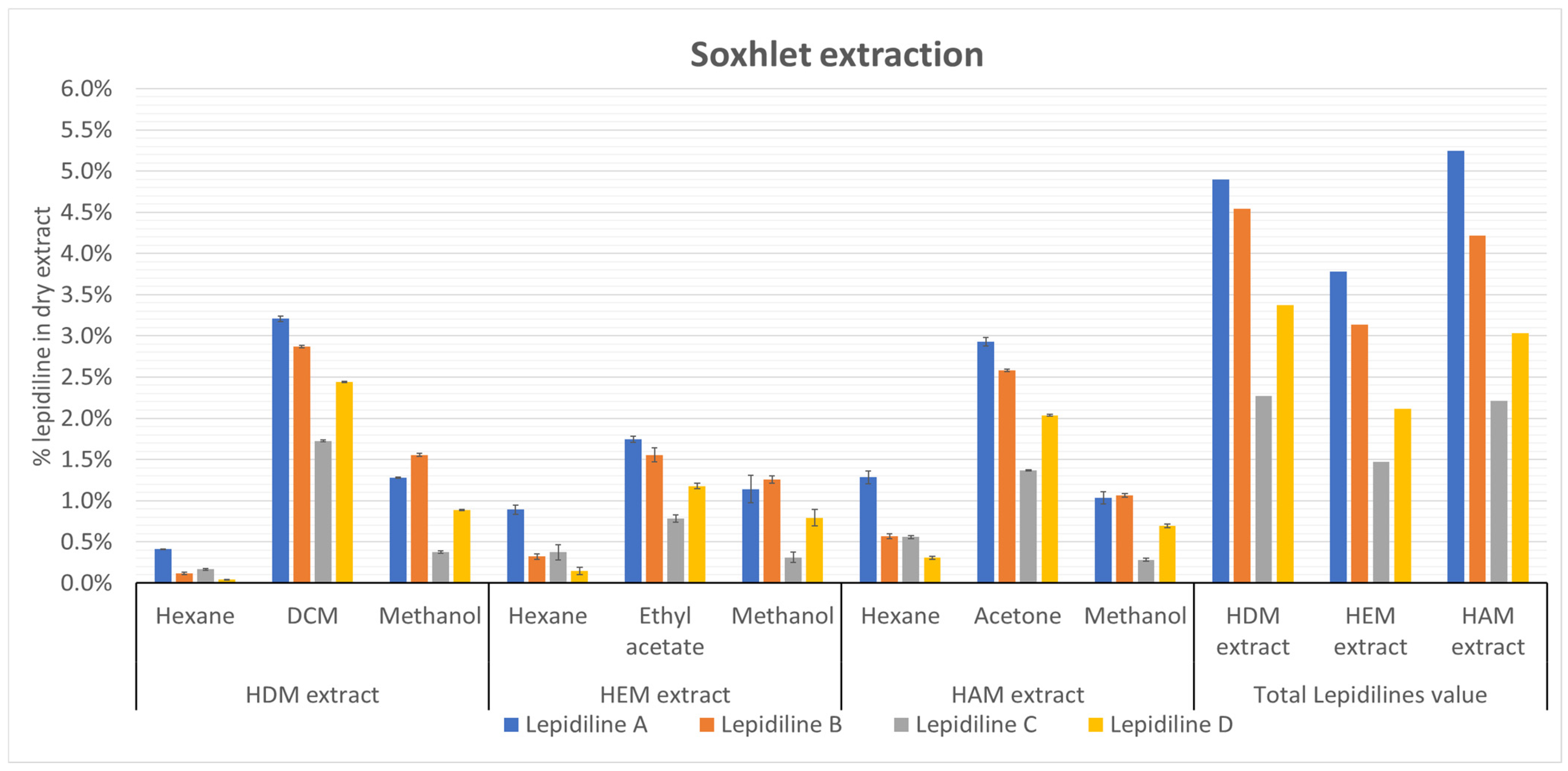 23], dichloromethane (DCM) emerged as the most effective solvent for lepidilines’ extraction in this study, as confirmed by the Soxhlet extraction protocol. The DCM extracts contained 3.21% ± 0.04%, 2.87% ± 0.01%, 1.72% ± 0.01%, and 2.44% ± 0.01% of lepidines A, B, C, and D, respectively. Additionally, acetone yielded satisfactory results, though with approximately 10% lower concentrations of lepidilines than DCM extraction. This suggests a low to medium polarity of lepidilines and indicates superior dissolution of these compounds in polar organic solvents relative to alcohols.