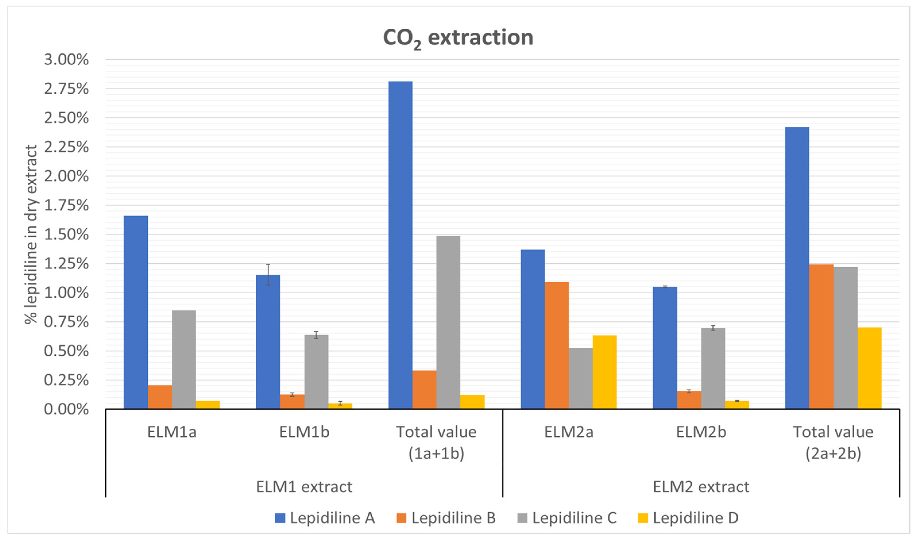 The supercritical CO2 extraction method demonstrated that carbon dioxide could recover the target alkaloids in appreciable quantities, yielding approximately 1% for lepidiline A, 0.1% for lepidiline B, 0.6% for lepidiline C, and 0.05% for lepidiline D. Interestingly, the addition of isopropanol as a co-solvent did not significantly enhance the extraction yield of lepidilines, indicating the higher efficiency of carbon dioxide as a solvent. Moreover, employing a higher extraction pressure of 250 bar proved more effective for extracting lepidilines B and D than 150 bar, possibly due to their apolar characteristics, which align with the expected behavior of low-polarity compounds.