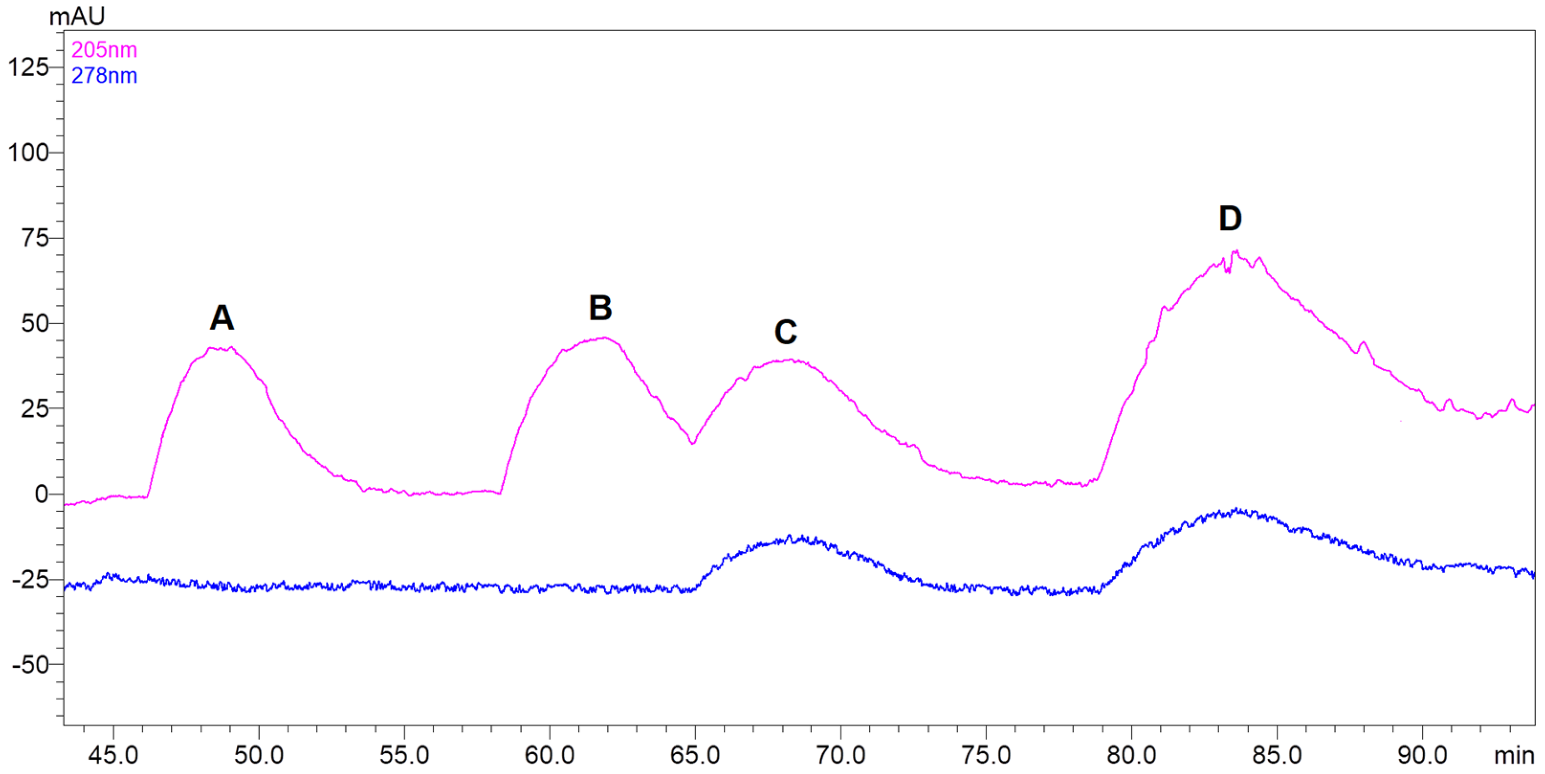 The solvents prepared for the analysis, solvent A (water with 5 mM ammonium acetate) and solvent B (methanol: acetonitrile 8:2 v/v), were both acidified to a concentration of 0.2% (v/v) with formic acid. The following gradient of the solvent B in A was applied: 0 min 29% B, 85 min 30% B, 120 min 35% B, and 130 min 100% B. The chromatogram was observed at the wavelengths of λ = 205 and 278 nm, and the flow rate was set at 20 mL/min.