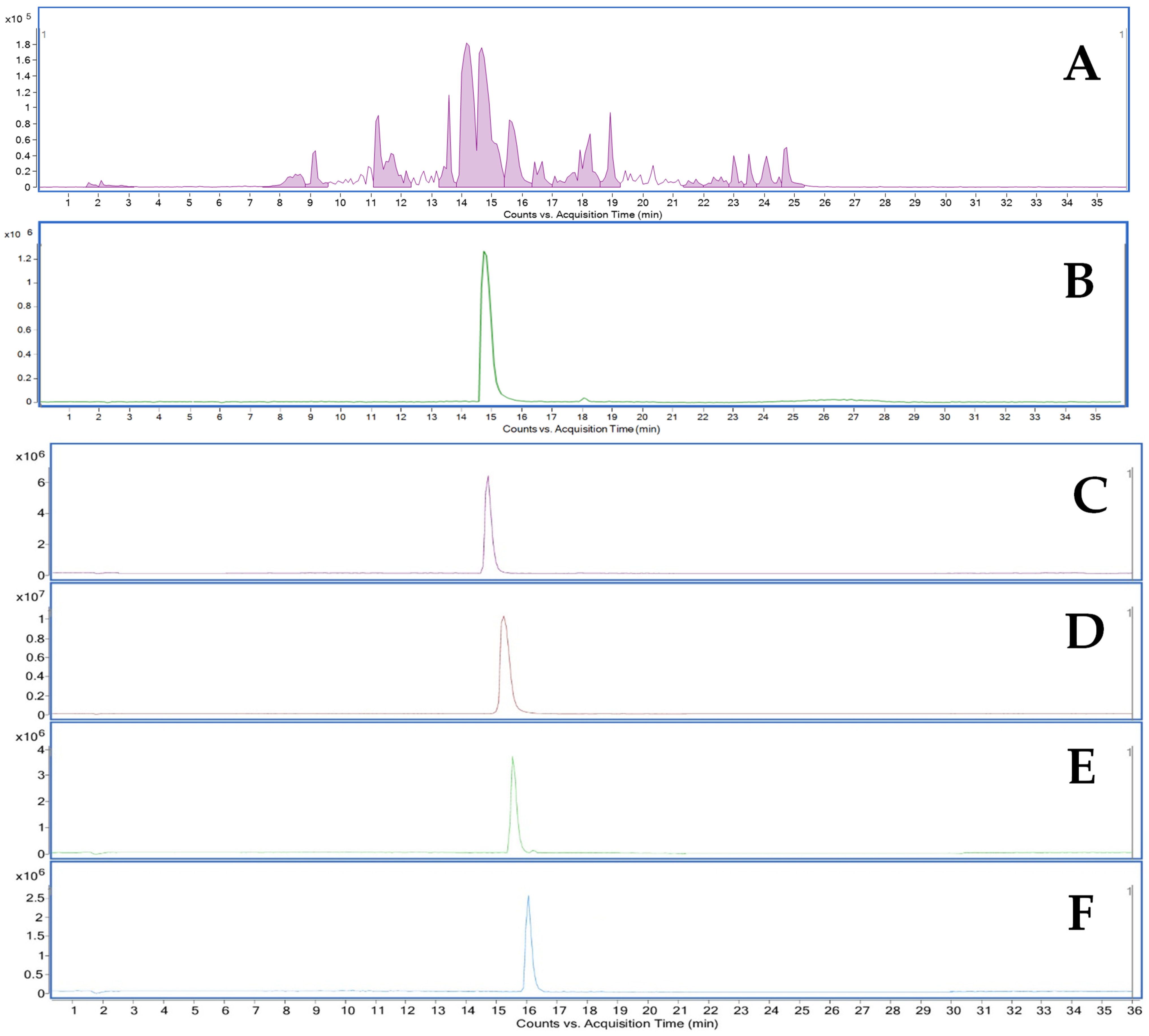 During the analysis, the HPLC thermostat was maintained at 25 °C, and the UV detection was set at 254, 280, 320, and 365 nm. The PDA detector operated in a 190–600 nm wavelength range. Chromatographic separation was achieved with a 10 μL injection volume and a 0.2 mL/min flow rate during a 36-min gradient elution program. The mobile phase consisted of eluent A (0.1% formic acid in water, v/v) and eluent B (acetonitrile with 0.1% v/v formic acid). The gradient elution was as follows: 0 min, 1% B; 2 min, 20% B; 3 min, 30% B; 10 min, 40% B; 17 min, 95% B; 19 min, 95% B; 19.5–36 min, 1% B.