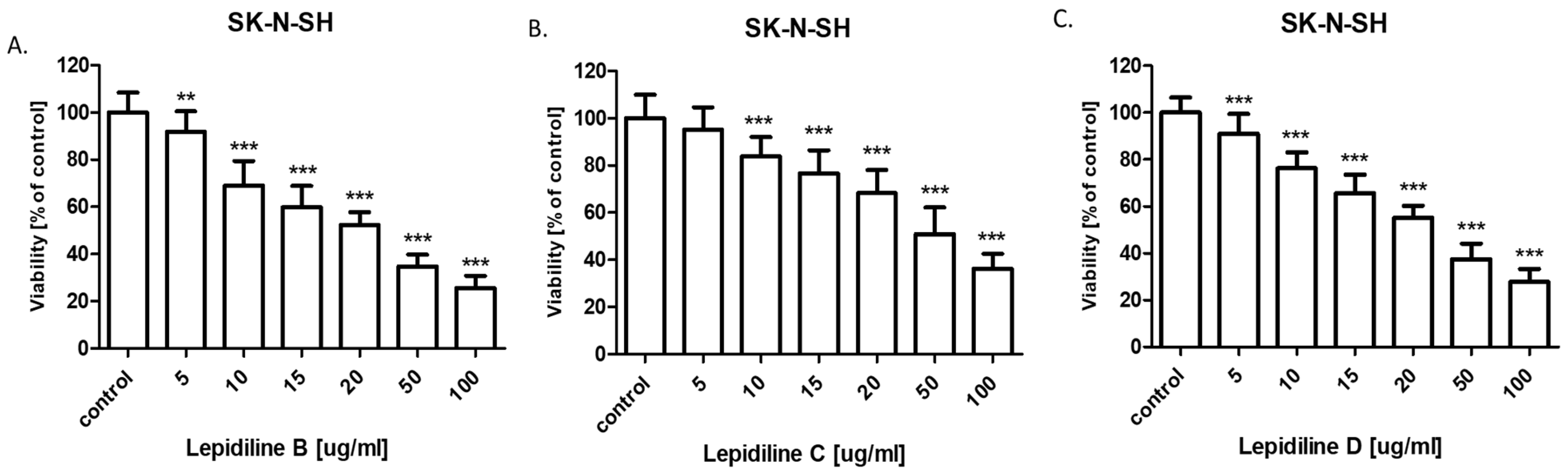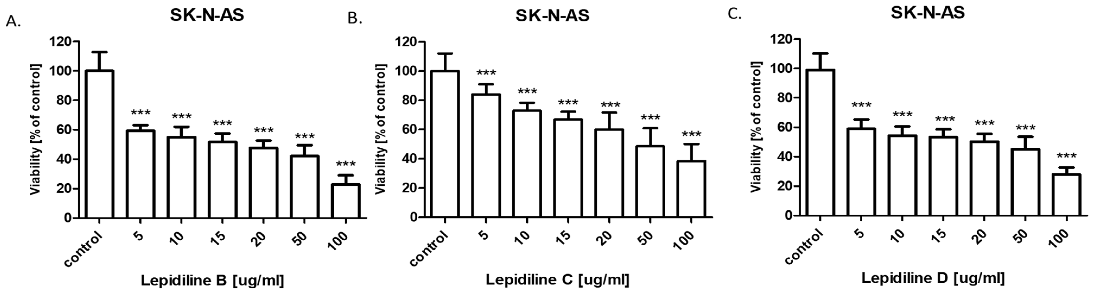 SK-N-SH and SK-N-AS cancer cells were plated on 96-well plates at a 2 × 104 cells/mL density. The cells were incubated with lepidiline B, C, and D at 5–100 µg/mL concentrations for 96 h. Then, the cancer cells were incubated with the MTT (3-(4,5-dimethylthiazol-2-yl)-2,5-diphenyltetrazolium bromide) solution (5 mg/mL, Sigma, St. Louis, MO, USA) for 3 h. During this time, MTT was metabolized by living cells to purple formazan crystals, which were later solubilized in SDS buffer (10% SDS in 0.01 N HCl) overnight. The optical density of the product was measured at 570 nm.