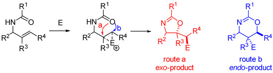 Recently, the electrophilic intramolecular cyclization of unsaturated amides has been recognized as an attractive and powerful tool for the synthesis of oxazoline derivatives due to the readily available substrates and relatively mild reaction conditions. An electrophile plays the role of an activator of the double or triple carbon–carbon bond towards subsequent attack of the oxygen atom of the amide carbonyl group to complete the intramolecular cyclization. When N-allyl amides are subjected to cyclization, the oxygen atom can attack at either electrophilic carbon atom, leading to the exo-product (oxazoline) and/or endo-product (Scheme 1). The regioselectivity of cyclization depends on the amide structure and the reaction conditions. If the N-allyl amide has an R3 substituent at the double bond, it undergoes exo-cyclization to oxazoline derivatives, and oxazine derivatives are not formed. On the other hand, if the amide is substituted with an R4 substituent, the corresponding dihydrooxazines are produced. Cyclization occurs at the atom where better stabilization is favoured by the presence of the substituent. Depending on the reaction conditions, R4-substituted amides may behave differently. For instance, under basic conditions, they may undergo exo-cyclization; under acidic conditions, they may undergo endo-cyclization [45]. Oxazolines obtained by the cyclization of N-allyl amides have a stereocenter at the C5 position of the ring. Therefore, stereoselective cyclization is a powerful strategy for constructing enantiomerically enriched heterocycles prevalent in pharmaceuticals and ligands.