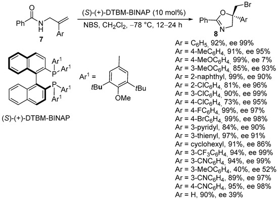 A notably improved enantiocontroling catalytic system for the bromocyclization of N-allyl amides 7 was elaborated by Hamashima (Scheme 6) [49]. Application of (S)-DTBM-BINAP as a Lewis base chiral catalyst and N-bromosuccinimide (NBS) as the bromination agent allowed us to obtain bromomethylated oxazolines 8 with excellent yields and enantioselectivities. The proposed catalytic mechanism of the catalysis involves generation in situ DTBM-BINAP monoxide as the enantioselective catalytic species in this reaction.