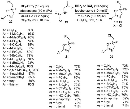 Qin and coworkers proposed intramolecular hypervalent iodine-catalyzed halogenation of N-allyl amides 19 substituted with phenyl ring in the styrenal position. 5-Chloromethyl- 20 and 5-bromomethyl-2-oxazolines 21 were produced using BCl3 and BBr3 as chlorinated and brominated reagents, respectively, and iodobenzene as a catalyst precursor in the presence of meta-chloroperoxybenzoic acid (Scheme 11) [55]. Various halogenomethylated oxazoline derivatives were synthesized through the catalytic process in high yields. Direct fluorination of the oxazoline ring in position C5 was observed when BF3·OEt2 as the fluorine reagent was applied under the same conditions (Scheme 11) [56]. Thus, 5-fluoro-2-oxazolines 22 were obtained with a yield of 62–95%. It should be noted that N-amides without the phenyl ring at the double bond treated with BF3·OEt2 underwent hypervalent iodine-catalyzed fluorocyclization to 5-fluoromethyloxazolines 17 and 18 (Scheme 10). All BF3, BCl3, and BBr3 reagents act as a halogen source and activating reagents in the hypervalent iodine(III)-catalyzed halogenations. However, the fluorine source in the fluorination is the [BF4]− ion, while the bromine/chlorine source in the bromination/chlorination is the Br−/Cl− ion. A detailed mechanistic study undertaken by the authors based on density functional theory calculations explains the difference in the behaviour of BF3·OEt2, BCl3, and BBr3 in the intramolecular hypervalent iodine-catalyzed halogenation of N-allyl amides [55].