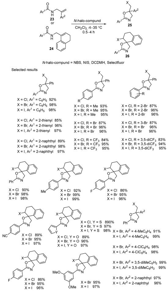 Metal-free synthesis of 5-chloromethyl-, 5-iodomethyl-, 5-fluoromethyl-, and 5-bromomethyl-2-oxazolines 25 including spiro derivatives 26 was reported using DCDMH, NIS, Selectfluor, and NBS, respectively, as the halogen source and oxidants (Scheme 12) [57]. The advantage of this method is that mild reaction conditions are required, and a metallic catalyst does not have to be used to obtain the halogenated oxazolines in high to excellent isolated yields (up to 99%).