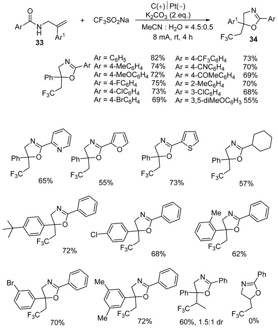 A green protocol for the electrochemical method for the synthesis of trifluoromethylated oxazolines using the Langlois reagent (CF3SO2Na) as a trifluoromethyl source has been reported [61]. According to this protocol, a series of N-allyl amides 33 were subjected to a reaction with CF3SO2Na, using K2CO3 as the base and a mixture of MeCN/H2O (4.5:0.5) as the cosolvent (Scheme 16). The reaction was conducted under constant current (8 mA) electrolysis conditions, using a graphite rod anode and a platinum plate cathode that led to trifluoromethylated oxazolines 34 in moderate to good yields. The scope of amides includes benzamide derivatives that are substituted with either electron-accepting or electron-donating groups, as well as heterocyclic amides. The cyclohexane-2-amide derivative was also found to be reactive in this reaction, producing the desired oxazoline in a yield of 57%. The presence of a phenyl ring in the vinyl position of the amide, whether substituted or not, appeared to be crucial for the outcome of the reaction. The reaction with simple N-allylbenzamide did not proceed.
