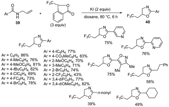 The well-known photocatalyst [Ru(bpy)3]2+ and Umemoto’s electrophilic trifluoromethylating reagent were adopted for regiospecific trifluoromethylative spirocyclization (CF3-spirocyclization) of cyclic N-allyl amides 37 (Scheme 18) [63]. The photocatalytic system enables the diastereoselective synthesis of CF3-containing spirooxazolines 38 from various amides with different cyclic alkene groups. The amide with a bulky 2,4,6-trimethylphenyl ring gave the corresponding oxazoline in a 73% yield with excellent diastereoselectivity (97:3 dr). No diastereoselctivity was observed in the reaction of [(1H-2-methylinden-3-yl)methyl]benzamide. Diastereoselectivity is thus dependent on the substituent of the amide group and the structure of the cyclic alkenes. Kawamura proposed a simple and efficient method for the synthesis of trifluoromethylated oxazolines using the Togni reagent in the presence of KI (Scheme 19) [64]. Reactions were carried out in dioxane at 80 °C and produced oxazolines 40 in good yields. Various substituents on the aromatic ring of N-allyl arylamide 39 were well tolerated under mild reaction conditions. The utility of the methodology was proved by applying two amides as substrates obtained from bioactive telmisartan and lithocholic acid. In both reactions, respective 5-trifluoromethyloxazolines were formed in 51 and 35% yields. Recently, a cobalt-catalyzed oxytrifluoromethylation of N-allyl amides 41 for the straightforward synthesis of various CF3-containing oxazolines 42 with Togni reagent as the trifluoromethyl precursor under mild reaction conditions has been developed (Scheme 20) [65]. In the presence of 7 mol% of Co(salen) in acetonitrile at 80 °C, the desired oxazolines 42 containing the CF3 moiety were obtained in a yield of 57–97%. The substrate scope is limited to benzamide and heteroaryl amide derivatives since alkyl amides are not tolerated in these conditions. The authors propose that the CF3-containing oxazolines were formed via a radical–cation crossover mechanism.