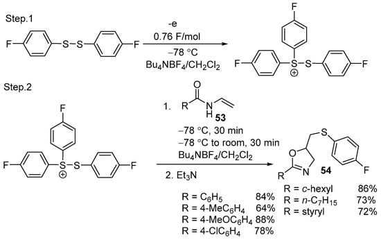 - Miyamoto, Y.; Mitani, N.; Yanagi, R.; Kashimura, S.; Suga, S.; Yoshida, J.; Matsumoto, K. Synthesis of Oxazolines Form N-Allylamides Using an Electrochemically Generated Ras(ArSS)Ar+ Pool. Heterocycles 2018, 96, 1373–1382. [Google Scholar] [CrossRef]