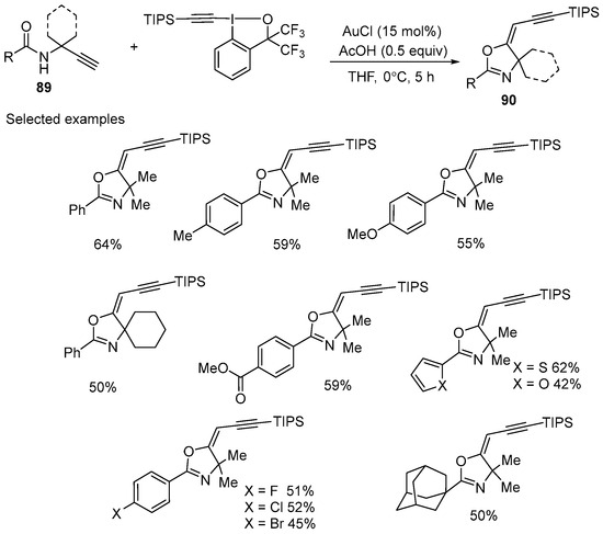 - Zhao, X.; Tian, B.; Yang, Y.; Si, X.; Mulks, F.F.; Rudolph, M.; Rominger, F.; Hashmi, A.S.K. Gold-Catalyzed Stereoselective Domino Cyclization/Alkynylation of N-Propargylcarboxamides with Benziodoxole Reagents for the Synthesis of Alkynyloxazolines. Adv. Synth. Catal. 2019, 361, 3155–3162. [Google Scholar] [CrossRef]