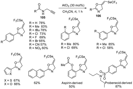 - Wang, J.; Niu, J.-Q.; Li, J.-C.; Liu, L.; Shang, X.; Zhou, P.-X.; Chao, S. Synthesis of SeCF3-Substituted Oxazines and Oxazolines through Electrophilic Trifluoromethylselenolation Cyclization of Propargylic Amides. J. Org. Chem. 2025, 90, 8353–8365. [Google Scholar] [CrossRef] [PubMed]