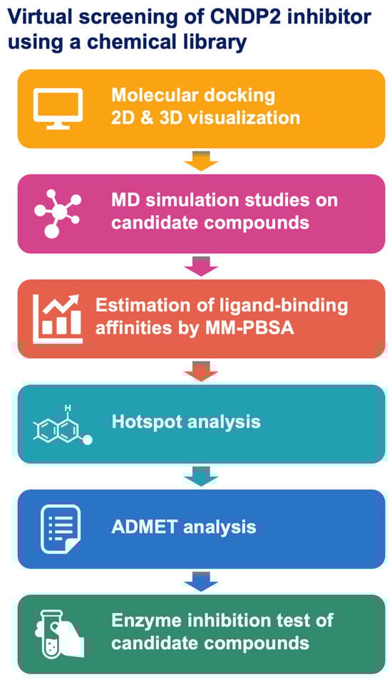 The discovery workflow for CNDP2 inhibitors, including structure validation, molecular docking, molecular dynamics (MD) simulations, binding free energy calculations, and ADMET analysis.