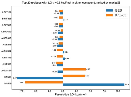Per-residue binding free energy decomposition analysis of the CNDP2–ligand complexes, which highlight key amino acid contributions to the stability of BES and KKL-35 binding. The vertical axis indicates amino acid residues and catalytic Mn2+ ions, whereas the horizontal axis shows the per-residue binding free energy contribution (ΔG, kcal/mol). The analysis highlights key residues that contribute to the stability of BES (blue) and KKL-35 (orange) binding. The top 20 residues are displayed with ΔG ≤ –0.5 kcal/mol in either compound, ranked by the maximum absolute contribution (max|ΔG|).
