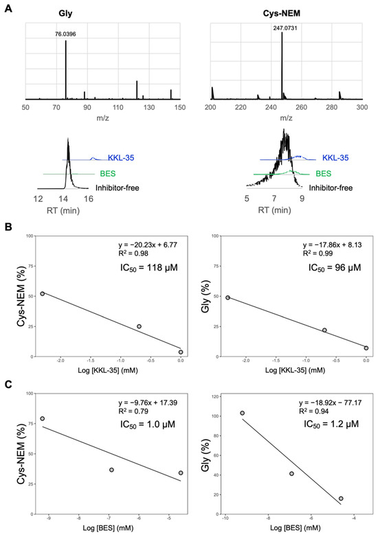LC–MS analysis of CNDP2-mediated Cys-Gly hydrolysis and its inhibition by BES and KKL-35. (A) LC–MS analysis of CNDP2-catalyzed hydrolysis of Cys-Gly and its inhibition by BES and KKL-35. Cys-Gly was hydrolyzed by CNDP2 to produce cysteine (Cys) and glycine (Gly). Cys was derivatized with N-ethylmaleimide (NEM) to form Cys–NEM. Mass spectra confirmed the identities of Gly (m/z 76.0396) and Cys–NEM (m/z 247.0731). Extracted ion chromatograms showing reduced levels of Gly and Cys–NEM in the presence of BES or KKL-35 compared with the inhibitor-free control. (B,C) Inhibition of CNDP2 enzymatic activity by KKL-35 (B) and BES (C). Dose-dependent inhibition of Cys-Gly hydrolysis was assessed by measuring the production of Cys (measured as Cys-NEM after derivatization) and Gly. KKL-35 exhibited IC50 values of 118 μM for Cys-NEM and 96 μM for Gly, whereas BES showed markedly higher potency, with IC50 values of 1.0 μM and 1.2 μM, respectively.