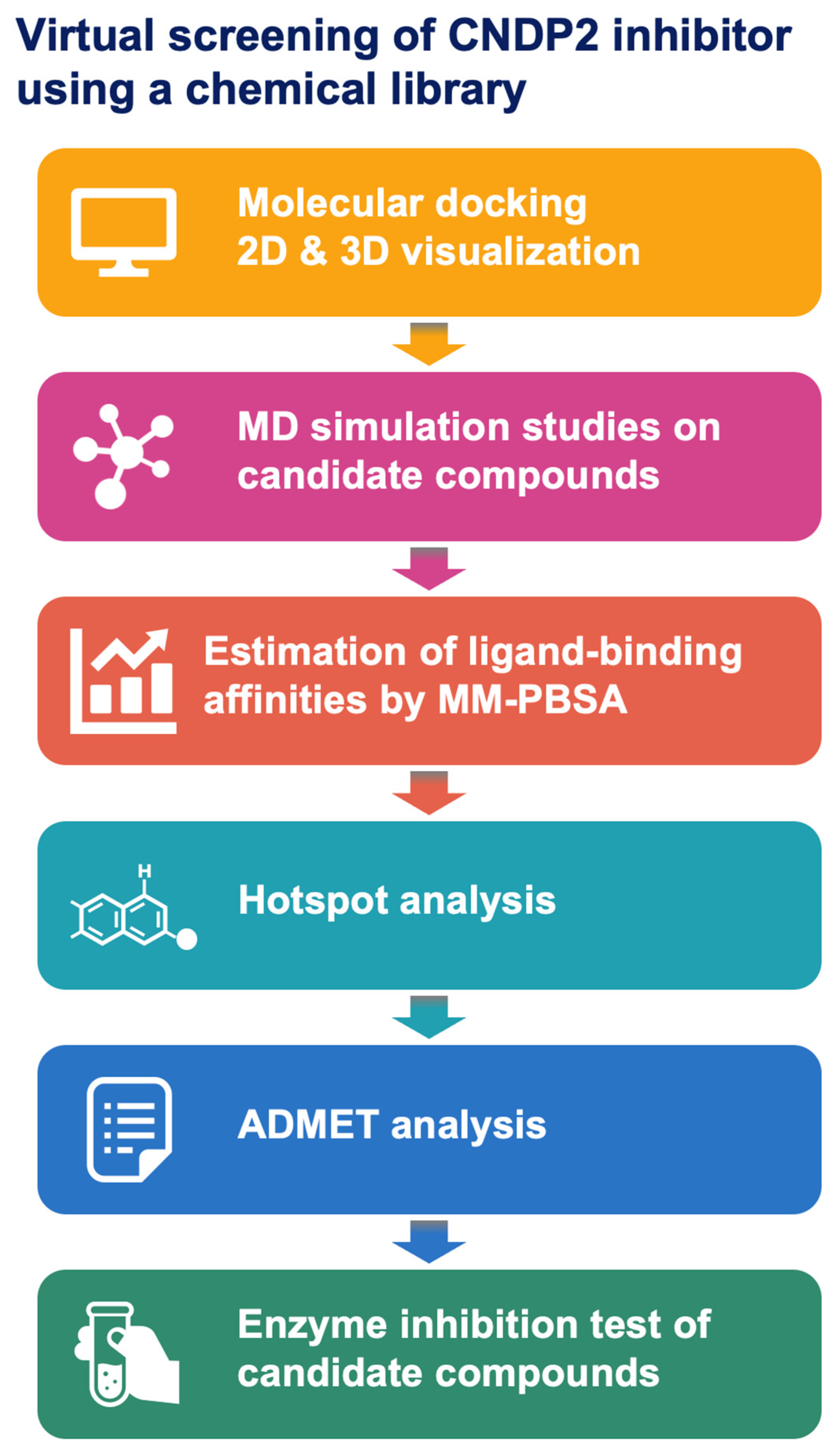 The strategy used for the discovery of CNDP2 inhibitors is presented in Figure 1. The workflow consisted of sequential computational and experimental steps, beginning with molecular docking and its visualization in 2D and 3D, followed by MD simulations of the candidate compounds. Estimation of ligand-binding affinities by MM-PBSA and hotspot analysis was conducted to refine the list of putative inhibitors. The candidates were assessed for their pharmacokinetic and toxicity profiles using ADMET analysis, and enzyme inhibition assays were performed to measure their activity. This systematic approach ensured that only structurally compatible, pharmacologically favorable compounds progressed through each stage of the analysis.
